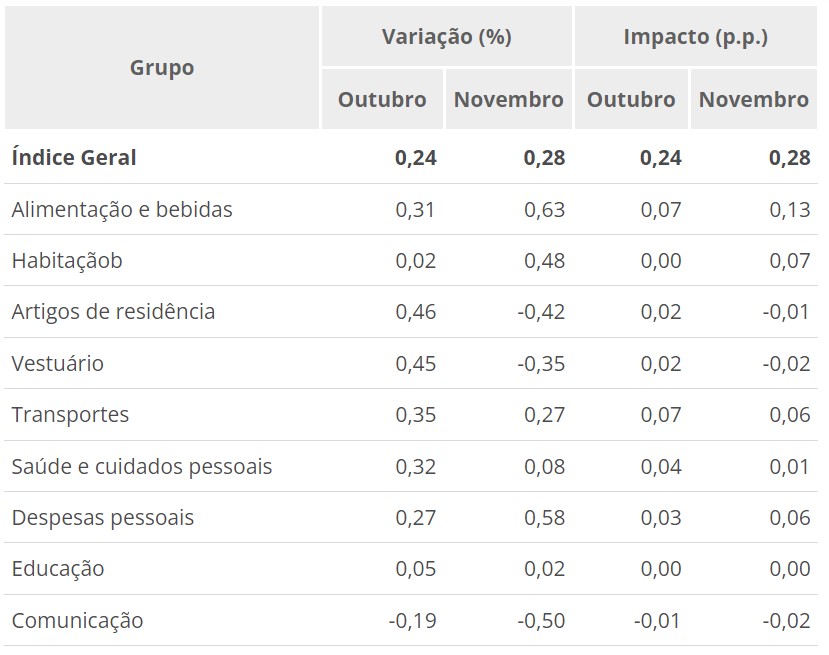 Seis dos nove grupos de produtos e serviços pesquisados tiveram alta em novembro. A maior variação foi do setor de alimentação e bebidas (0,63%), após subir 0,31% em outubro. A alimentação no domicílio subiu 0,75% em novembro, influenciada pelas altas da cebola (26,59%), batata-inglesa (8,83%), arroz (3,63%) e carnes (1,37%). No lado das quedas, os destaques foram o tomate (-6,69%), a cenoura (-5,66%) e o leite longa vida (-0,58%).